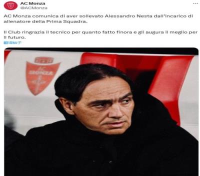 蒙扎宣布解除内斯塔作为一线队教练的职务。俱乐部感谢教练迄今为止所做的一切,并祝愿他未来一切顺利。