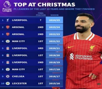 体育资讯12月24日报道宣称 利物浦在本轮英超大胜热刺,他们也以圣诞冠军身份迎来新年。数据统计显示,英超近9年圣诞冠军最终5次夺冠。