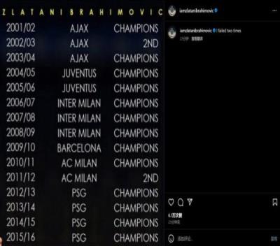 在伊布的配图中,他曾在2002年-2016年期间夺得13座联赛冠军,其余两年排名第二。伊布写道:我只失败了两次。
