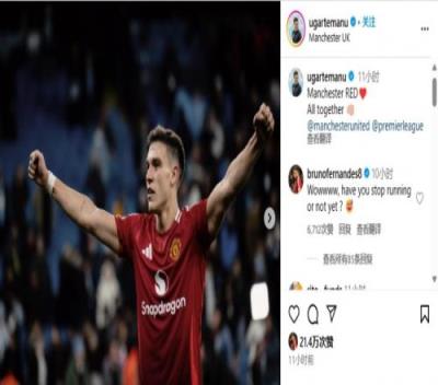 赛后,乌加特更新社媒庆祝胜利,他写道:“曼彻斯特是红色的,团结一致”。在评论区,B费写道:“Wowwww,你是否停止奔跑了?”