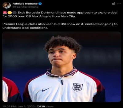 体育资讯1月9日报道宣称 据名记罗马诺独家消息,多特联络了曼城,探索引进19岁后卫阿莱恩的可能性。