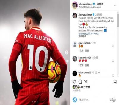 麦卡利斯特在社交媒体上晒出背影照片,并配文:“安菲尔德神奇的节礼日,再拿三分继续强势领跑。”