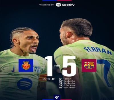 巴萨第3次客场4球大胜马洛卡,送后者主场西甲100负
