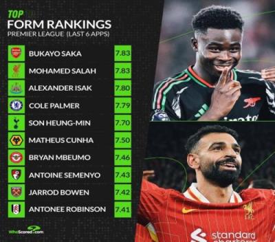 whoscored英超状态榜:萨卡萨拉赫并列居首,帕尔默孙兴慜在列