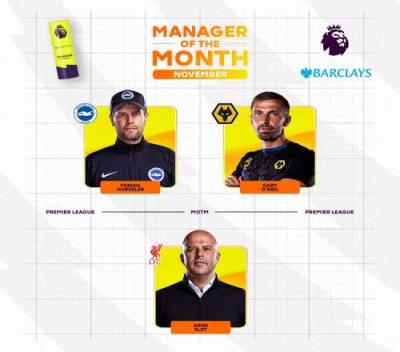 体育资讯12月5日报道宣称 英超官方公布了11月最佳教练的候选名单,赫尔泽勒、奥尼尔、斯洛特在列。