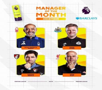 体育资讯1月2日报道宣称 英超官方公布了12月最佳主帅的候选名单,分别是努诺、埃迪-豪、伊拉奥拉和斯洛特。