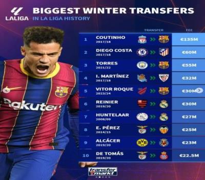 西甲历史冬窗转会费榜:库蒂尼奥1.35亿欧居首,迭戈科斯塔次席