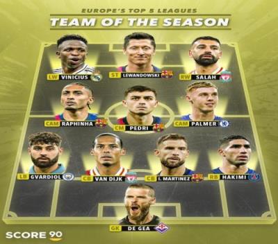 Score90本赛季至今五大联赛最佳阵:维尼修斯、莱万、萨拉赫在列