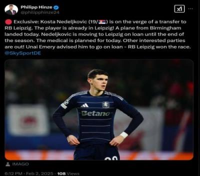 目前,球员已经乘坐飞机从伯明翰抵达了莱比锡。内德伊科维奇将以租借形式加盟莱比锡,直到本赛季结束。球员的体检计划在今天进行。维拉主帅埃梅里建议这名小将外租锻炼,现在莱比锡赢下了球员争夺战。