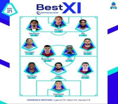 体育资讯1月21日报道宣称 意甲第21轮结束 ,意甲官方也评选出本轮联赛最佳阵,其中邓弗里斯、姆班古拉在列。以下为具体阵容: