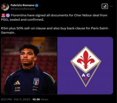 体育资讯2月3日报道宣称 名记罗马诺消息,佛罗伦萨已经签署了引进恩杜尔所需的一切文件,巴黎将收到500万欧元的转会费,还有恩杜尔50%的二次转会费的分成条款。同时,巴黎也拥有优先回购恩杜尔的条款。