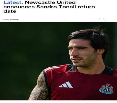 体育资讯08月15日报道宣 纽卡官方消息,托纳利即将结束为期10个月的禁赛,并于8月28日重返赛场。