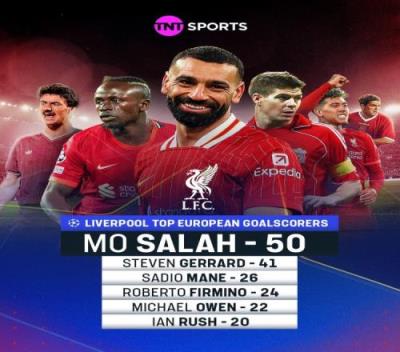 据TNT统计,萨拉赫已在欧战比赛中为利物浦攻入50球,队史最多。