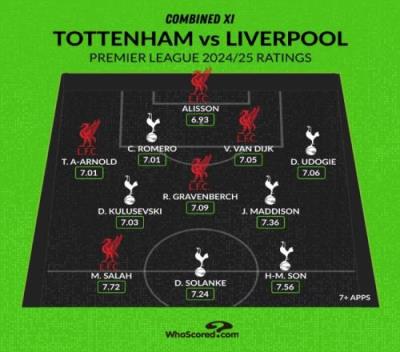 体育资讯12月22日报道宣称 本轮英超将迎来焦点战,热刺坐镇主场对阵利物浦。whoscored也统计了双方合体本赛季英超评分最佳阵。