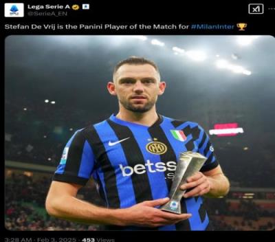 体育资讯2月3日报道宣称 刚刚结束的米兰德比中,国米1-1绝平米兰。赛后,打入绝平进球的德弗里当选全场最佳球员。