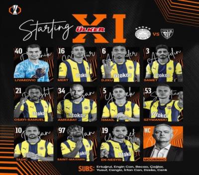 费内巴切首发:40-利瓦科维奇、16-梅尔特-穆尔杜、6-德吉库、3-萨梅特-阿卡丁、21-奥萨伊-萨缪尔、34-阿姆拉巴特、5-伊斯梅尔-尤克塞克、53-塞巴斯蒂安-希曼斯基、10-塔迪奇、97-圣马克西曼、19-恩-内斯里
