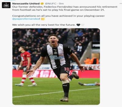 体育资讯12月12日报道宣称 纽卡官方晒照,前纽卡后卫费德里科-费尔南德斯宣布退役,12月21日将是他职业生涯的最后一场比赛。纽卡官方向他表示了祝福。
