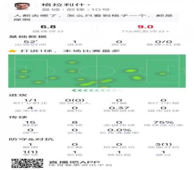 格拉利什本场数据:替补登场破门,4对抗2成功,评分6.8分