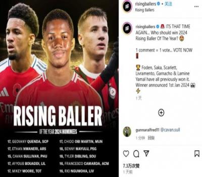 RB年度最佳新人奖是由Rising Ballers组织设立的,旨在表彰在足球领域表现突出的年轻球员,福登、萨卡、亚马尔等人曾夺得该奖。