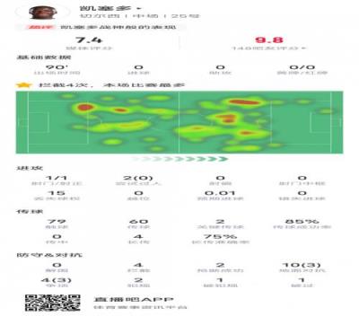 凯塞多本场比赛数据:4拦截全场最高+2关键传球2抢断,评分7.4