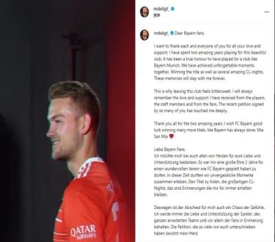 体育资讯08月14日报道宣 德里赫特即将加盟曼联,他社媒发文告别拜仁。
