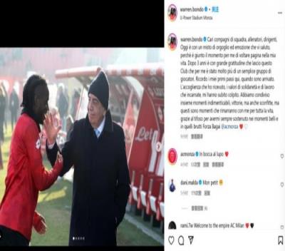 米兰新援邦多社媒发文:怀着无比感激的心情告别蒙扎