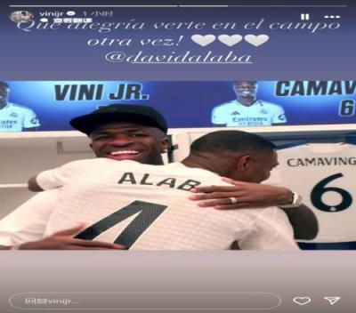 赛后,维尼修斯更新社媒晒出了自己在更衣室与阿拉巴拥抱的照片庆祝他回归,并配文:真的很高兴在球场上再次见到你。