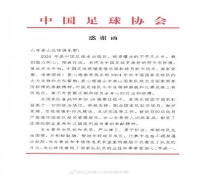 体育资讯1月3日报道宣称 为感谢山东泰山俱乐部对于国家队的大力支持,中国足协向山东泰山俱乐部发去了感谢信。