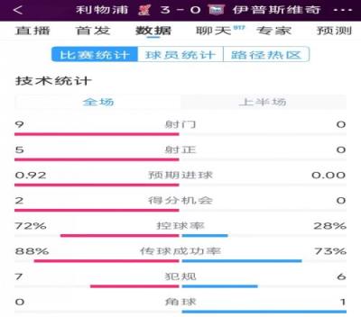 半场打花,利物浦vs伊普斯维奇半场数据:射门90,射正50
