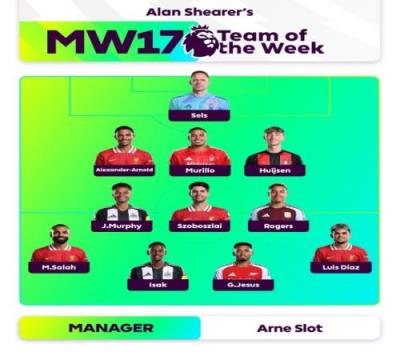 体育资讯12月23日报道宣称 英超联赛第17轮战罢,英格兰名宿阿兰-希勒评选出了本轮比赛的最佳阵容,利物浦4人入选,纽卡、诺丁汉森林各2人在列,热苏斯&伊萨克搭档锋线。