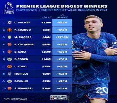 体育资讯12月23日报道宣称 德转今日盘点2024年英超球员身价涨幅排名,切尔西球员帕尔默涨幅最大,从4500万欧元上涨到1.3亿欧元,梅努、罗杰斯排在二三位。