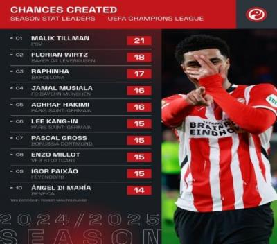 本赛季欧冠创造机会榜:蒂尔曼21次居首,维尔茨、拉菲尼亚二三位