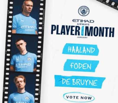 体育资讯1月31日报道宣称 曼城1月的比赛已经全部结束,球队取得了5胜1平1负的成绩。曼城官方公布了1月队内最佳球员候选名单,分别是哈兰德、福登和德布劳内。