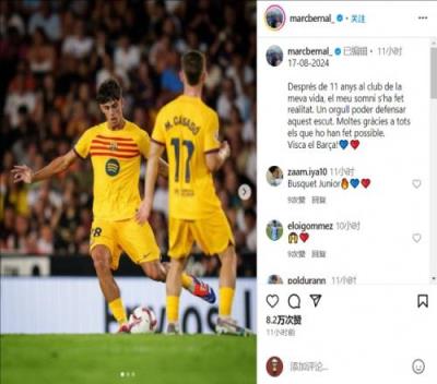 伯纳尔写道:“17-08-2024,经过11年在俱乐部的生活,我的梦想终于成真。我很荣幸能够捍卫自己的球队,感谢所有让这一切成为可能的人们。巴萨万岁!”