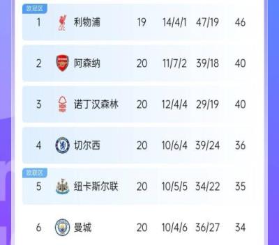 诺丁汉森林豪取英超6连胜,目前积分追平第二的阿森纳,领先第四的切尔西4分,领先第五的纽卡5分,很有希望取得欧冠席位。