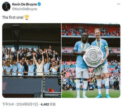 德布劳内社媒晒图庆祝社区盾杯夺冠:第一个!