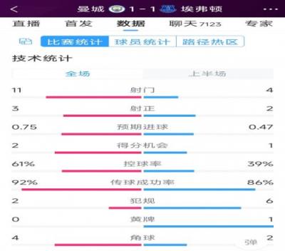 曼城vs埃弗顿半场数据:射门114,射正32,得分机会21
