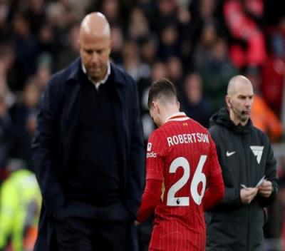 体育资讯12月15日报道宣称 本轮英超,十人利物浦2-2战平富勒姆,罗伯逊第16分钟就领红下场,十人作战的利物浦本场两度落后两度扳平,从主场艰难拼下1分。