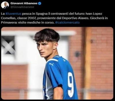 记者表示:“尤文图斯即将签下阿拉维斯中锋伊万-洛佩斯-科梅拉斯,他出生于2007年,加盟尤文后将为预备队效力,目前他正在接受体检。”
