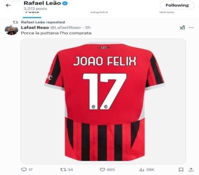 图片中是米兰本赛季的球衣,印的名字是菲利克斯,印号是17号。
