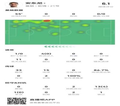 安东尼本场1射0正4过人0成功14对抗4成功+2造犯规获评6.1分