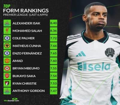 WhoScored英超球员近6场评分排名:伊萨克居首萨拉赫帕尔默二三