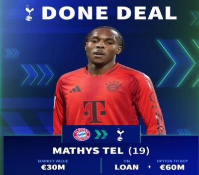体育资讯2月4日报道宣称 拜仁19岁前锋特尔正式租借加盟热刺,后者保留了约6000万欧元的买断条款。记者Kerry Hau对此进行了解释。