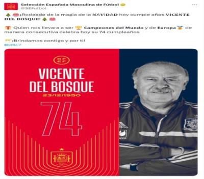 西班牙队官方社媒晒出博斯克的生日海报,并配文:“被圣诞的魔力包围,今天是博斯克的生日!”