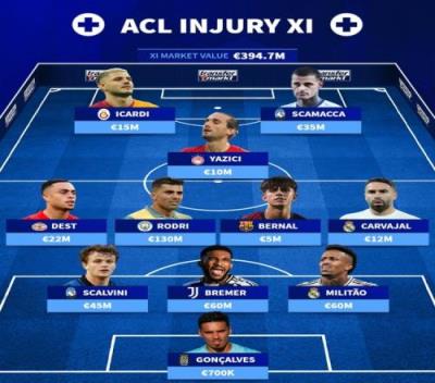 体育资讯11月13日报道宣称 德国转会市场列出了十字韧带受伤球员阵容,罗德里、伊卡尔迪、卡瓦哈尔、米利唐在列,德转总价3.947亿欧。