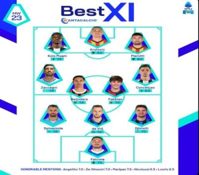 体育资讯2月4日报道宣称 意甲第23轮战罢,意甲官方也评选出本轮最佳阵容,其中德弗里、赖因德斯、穆阿尼在列,以下为具体阵容: