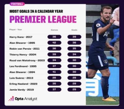 体育资讯12月19日报道宣称 Opta列出了英超历史自然年进球榜,2017年凯恩打进39球最多,2023年哈兰德攻入29球排名并列第8位。