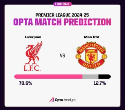 一边倒!Opta预测双红会:利物浦赢球概率超7成,曼联12.7%