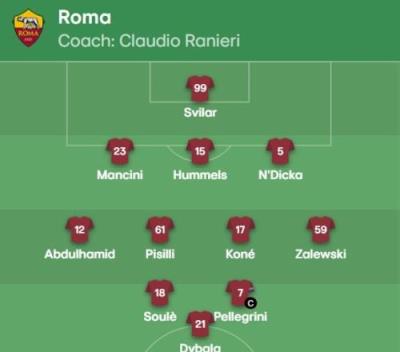 罗马首发:99-斯维拉尔、23-曼奇尼、15-胡梅尔斯、5-恩迪卡、12-阿卜杜哈米德、61-佩西利、17-科内、59-扎莱夫斯基、18-苏莱、7-佩莱格里尼、21-迪巴拉