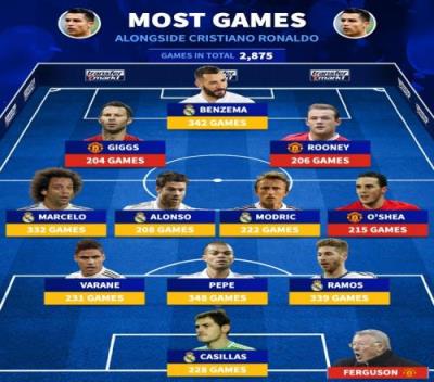 和C罗一起出场最多队友阵:魔笛本泽马在列,鲁尼吉格斯两翼齐飞
